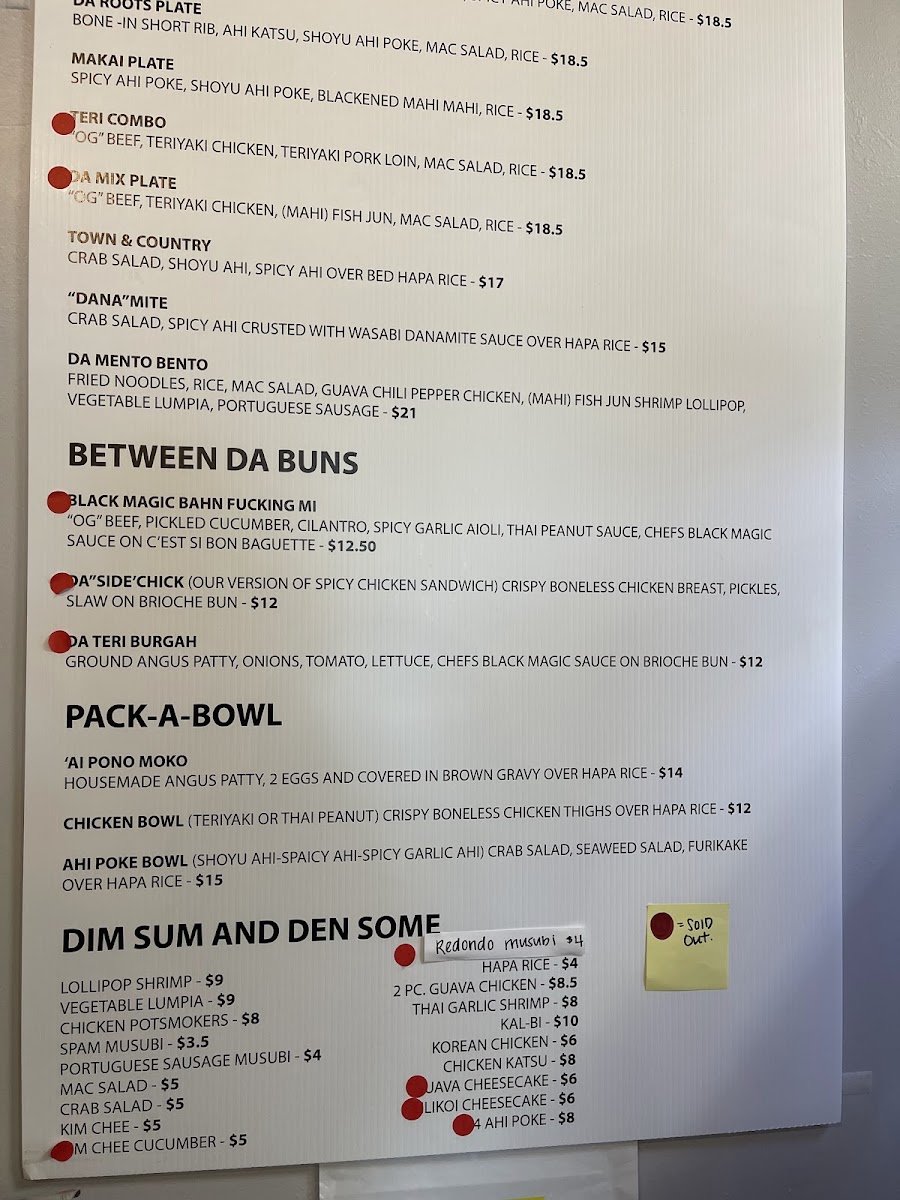 Garlic Butter Mahi Mahi, Black Magic Teri Beef, Spicy Ahi Poke, Rice & Mac.